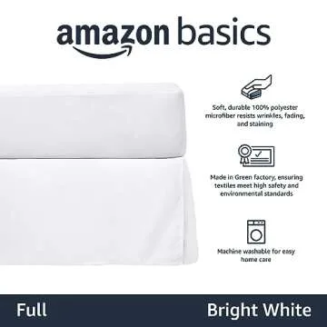 Show moreTransform your bedroom into a sanctuary of style and functionality with the Amazon Basics Lightweight Pleated Bed Skirt. Designed for full-size beds, this bed skirt (54 x 75 inches) comes in a stunning Bright White solid color, perfectly complementing any bedding ensemble. Its 16-inch drape not only adds a sophisticated touch but also effectively conceals your box spring, metal bed base, and under-bed storage, creating a cleaner, more polished look. Made from soft, durable 100% polyester microfiber, this bed skirt resists wrinkles, fading, and staining to maintain its chic appearance over time.