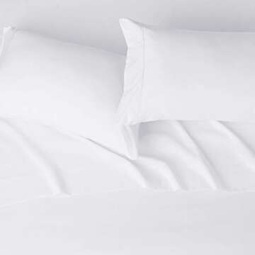 Show more The Amazon Basics Lightweight Soft Microfiber 4-Piece Bed Sheet Set is your ultimate solution for creating a comfortable sleeping space and cozy bedroom environment. This queen-size bed sheet set includes everything you need for a blissful night’s sleep: a generous 90 x 102 inch flat sheet, a 60 x 80 x 14 inch fitted sheet, and two 20 x 30 inch standard pillowcases. Crafted from premium polyester microfiber, these sheets are less prone to snags and tears, ensuring a durable and long-lasting product. With velvety softness, this bed sheet set promises an incredibly cozy experience on any mattress.