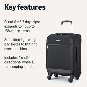 Show moreIntroducing the **Amazon Basics 21" Medium Carry-On Softside Suitcase**, the ultimate travel companion designed for both convenience and efficiency. Whether you’re embarking on a weekend getaway or a week-long adventure, this suitcase is perfectly sized at 14.4 x 8.3 x 20.9 inches (including wheels), ensuring seamless compliance with most airline carry-on regulations. With its flexible softside design, it fits effortlessly in overhead compartments, while its expandable capabilities allow you to increase packing space by up to 18%. This thoughtful design caters to travelers who prioritize ease and functionality.