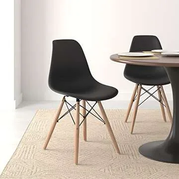 Show more Introducing a stunning set of four modern dining chairs that are as functional as they are stylish! Crafted with sturdy molded plastic and supported by elegant beech wood legs, these chairs are the perfect addition to your dining room, living room, kitchen nook, or entryway. The sleek and ergonomic design of each chair not only enhances aesthetic appeal but also provides lasting comfort and supportive curves that make every sit enjoyable.