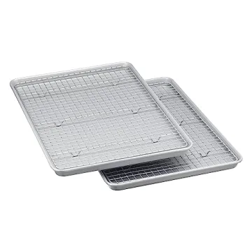 Show more If you're on the hunt for the perfect gift for culinary enthusiasts and home bakers, the Amazon Basics Nonstick Baking Sheets & Cooling Rack Set is exactly what you need. This essential set includes two sturdy half-sheet pans along with two well-designed wire cooling racks, all crafted from durable, high-quality steel. Featuring a nonstick ceramic coating, these pans promise effortless food release, making both baking and cleanup seamless and hassle-free. The best part? This coating is PFOA and PTFE free, ensuring you can bake with confidence.