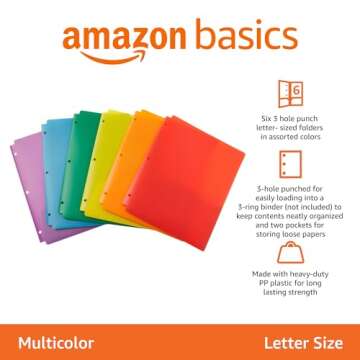 Amazon Basics Plastic 3 Hole Punch Folders with 2 Pockets, 8.5 x 11 inches, Pack of 6, Assorted Color