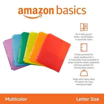 Show more Introducing the Amazon Basics Heavy Duty Plastic Folders, a must-have accessory for anyone striving to maintain organization in their documents. These letter-size file folders come in a vibrant 6-pack assortment of colors, ideal for storing your 8.5 x 11-inch documents. Perfect for home, school, or work, these folders are designed to accommodate your needs with their durable plastic material that ensures long-lasting use.