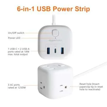 Amazon Basics Power Strip Cube 3 Outlet 3 USB Ports, 1 USB-C(15W) and 2 USB-A(12W), 5 ft Extension Cord, Home, Office, Travel, White