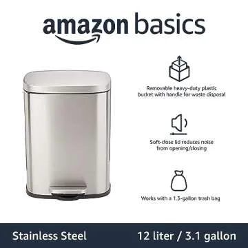 Show more Meet the ideal trash can that revolutionizes waste disposal in your home! With a convenient size of 12 liters (3.1 gallons), measuring 11.3 x 9.9 x 15.1 inches, this stainless steel trash can is designed for smaller spaces such as bathrooms, kitchens, or cozy offices. Its ultra-durable construction features a smudge-resistant exterior and a heavy-duty plastic inner bucket, ensuring longevity and reliable strength that withstands everyday use.