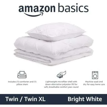 Show moreIntroducing the Amazon Basics Soft, Lightweight Twin Size Comforter Sets, a flawless blend of comfort and elegance designed for your perfect bedroom oasis. This all-season down-alternative bedding set features a classic pinch-pleat design, elevating the aesthetic of any room while providing the warmth and coziness you deserve. Crafted from a lightweight microfiber shell and filled with soft, breathable down-alternative, this comforter is perfect for maintaining an ideal sleep environment, whether it's spring or winter. Sized at 68 x 94 inches, it’s perfectly tailored to fit both Twin and Twin XL beds, making it a versatile choice for any sleeping arrangement. Achieve a luxe look with the piped edges that add a touch of sophistication to your decor.