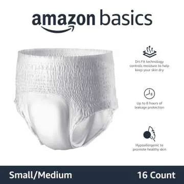 Show more Introducing the Amazon Basics Incontinence Underwear for Men and Women in Small/Medium, available in a convenient 16-count package, designed specifically for overnight absorbency. With advanced Dri-Fit technology, this product ensures effective moisture control, allowing users to maintain dry and comfortable skin throughout the night. Its dual odor control feature neutralizes and prevents unpleasant odors, making it an ideal choice for anyone needing discreet support.