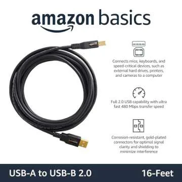 Show more The Amazon Basics USB-A to USB-B 2.0 Cable is an essential accessory for anyone seeking reliable connectivity between speed-critical devices and their computers. This remarkable cable stretches a generous 16 feet, giving you the freedom to connect peripheral devices like printers, external hard drives, and cameras from a comfortable distance. With its corrosion-resistant, gold-plated connectors, you can expect optimal signal transmission and durability that outlasts the competition.