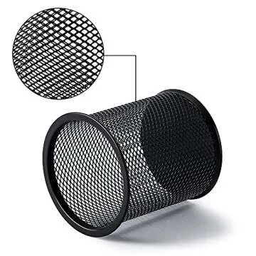 Show moreElevate your workspace with the Amazon Basics Wire Mesh Pen Cup, designed to not only hold your pens, scissors, and other writing utensils, but also to enhance your office or home decor. Crafted from durable steel wire, this pencil cup features a stunning mesh design that exudes an industrial charm. Its powder-coat finish in sleek black gives it a professional appearance, making it a perfect addition to any environment, whether it's an executive office, a home study, or a busy classroom.