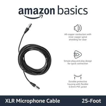 Show more Introducing the **Amazon Basics XLR Microphone Cable**, a top-tier solution for all your audio connection needs. Designed for seamless compatibility with XLR-compatible PA systems, speakers, and an array of sound equipment, this 25-foot cable brings exceptional sound clarity and durability to your setup. With **all-copper conductors**, it guarantees clear and distortion-free audio transmission, ensuring that your audience experiences every nuance of your performance. Whether you're in a studio, on stage, or recording at home, this cable is engineered to minimize noise interference and maintain the integrity of your sound.