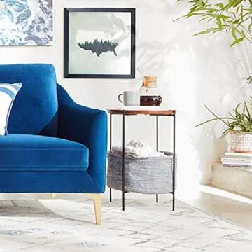 This clever piece is an all-in-one side table and a great place for guests to park keys and phones. Wood top and narrow legs provide a modern feel, while the cloth basket is handy for storage.