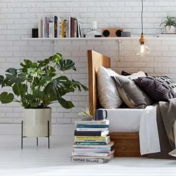 This two-tone pale green and white round stoneware planter is an attractive piece on its own. Combined with an iron shelf/stand, it makes a mid-century style statement in addition to holding plants. Planter and shelf can be used together or separately.