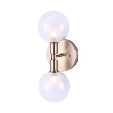 Show more Introducing the Amazon Brand - Rivet Mid-Century Modern Double Glass Globe Wall Sconce, an exquisite piece that sets the perfect tone for any room with its stunning design and functionality. This wall sconce combines Art Deco and Mid-Century elements, featuring a striking gold-finished metal body paired with hand-blown clear glass globes that radiate elegance and warmth. Measuring 5 inches wide by 6 inches deep, and standing at 13.5 inches tall, this beautiful sconce not only serves as an effective light source but also adds a touch of vintage glam to your home decor. Whether installed in a hallway, staircase, or living area, it effortlessly complements various interior styles—from modern to traditional—enhancing the overall ambiance of your space.