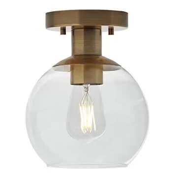 Show more This gorgeous mid-century flush-mounted ceiling light elevates your space with its blend of contemporary and classic styles. Crafted with elegant gold plating and a clear glass dome, this fixture creates a sophisticated and classy profile that seamlessly complements any décor. At dimensions of 8.87 inches wide, 7 inches deep, and 7 inches high, it’s the perfect size for various settings, whether it's in your hallway or foyer.