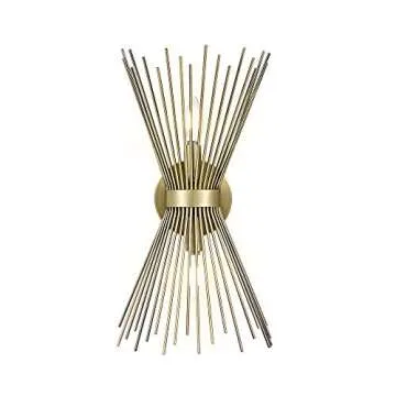 Show moreTransform your living space with the Amazon Brand – Rivet Mid-Century Modern Metal Starburst 2-Light Wall Sconce Lamp. This remarkable light fixture blends mood lighting with eye-catching design, showcasing 20 decorative metal rods finished in a sophisticated antique gold. Whether you're illuminating a hallway, bedroom, or bathroom, this sconce is more than just a light; it’s a stunning piece of art that enhances the aesthetics of your interior.