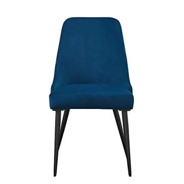 Show moreExperience the perfect blend of style and comfort with the Amazon Brand – Rivet Modern High-Back Padded Dining Chair. Designed to elevate your dining area, this set of two chairs features a stunning deep blue upholstery that exudes sophistication and elegance. The striking contrast of tapered black metal legs not only adds a chic touch but also ensures a robust and stable seating option. Measuring 19"W x 22.75"D x 35.25"H, with a seat height of 19.25"H and a depth of 18"D, these chairs are optimally designed for comfort and style. Lightweight yet sturdy, they are perfect for any contemporary dining setting or even in a casual corner of your home.