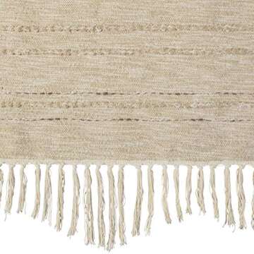 Measuring 50 inches long by 60 inches wide, this lightweight blanket offers a soft handfeel that is both cozy and breathable. Perfect for year-round use, it can easily be draped over any furniture piece or utilized during chilly evenings on the couch. The hand-tied fringe is not only visually appealing but also adds extra flair that elevates the overall look of any room.