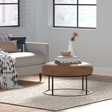 Amazon Brand – Rivet Revere Round Leather Iron-Framed Ottoman, 30.3"W, Cognac
