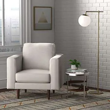 This modern armchair features simple lines and square armrests atop tall tapered legs, giving it a minimalist look that pairs well with most decor styles