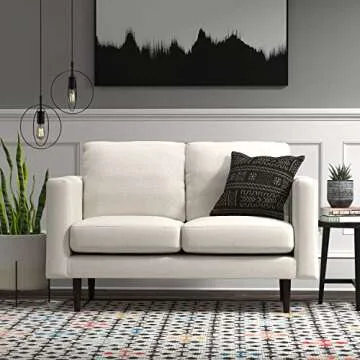 This modern loveseat features simple lines and square armrests atop tall tapered legs, giving it a minimalist look that pairs well with most decor styles.