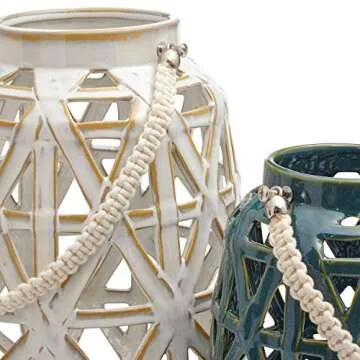 Show moreIlluminate your space with the stunning Amazon Brand – Stone & Beam Modern Farmhouse Decorative Candle Holder Lantern with Cutouts - Set of 2. These beautiful stoneware containers are not only functional but also serve as exquisite decor pieces that enhance any room's ambiance. With a distinctive cut-out pattern, they provide soft, atmospheric lighting that can elevate your evening gatherings or cozy nights in. Crafted with care, the elegant cream and blue shades complement a variety of settings, making them a perfect addition to both modern and traditional homes. The handles ensure easy transport, allowing you to effortlessly move them wherever you need a touch of charm.