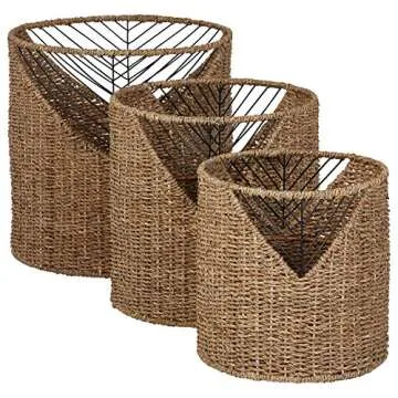 Show moreIntroducing the Amazon Brand – Stone & Beam Modern Round Seagrass Storage Basket Set, a stylish and functional addition to any home. Crafted from durable seagrass with gold metal accents, this pack of three baskets brings a touch of elegance to your living space while providing an easy solution for organization. The versatile design allows you to store a variety of items, from blankets and magazines to toys and miscellaneous clutter. Each basket features convenient openings serving as side handles, making transportation and access effortless. When not in use, simply stack them inside one another to save valuable space, ensuring your home remains tidy and chic.