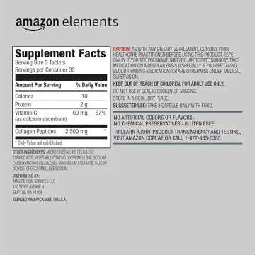 Show moreIntroducing the Amazon Elements Collagen Peptides + Vitamin C, a powerful dietary supplement designed to support your health and wellness journey. Each serving packs an impressive 2500 mg of collagen peptides combined with 60 mg of Vitamin C, two essential components known for their remarkable benefits. Sourced from high-quality bovine, this product contains Type I and III collagen, which are vital for maintaining healthy skin, hair, nails, and joints. Perfectly gluten-free, it's an excellent choice for anyone seeking to enhance their beauty and vitality from the inside out.