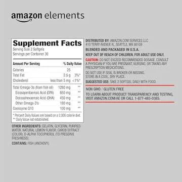 Amazon Elements Omega 3 Wild-caught Fish Oil + CoQ10 with Natural Lemon Flavor, EPA & DHA Omega-3 fatty acids, 60 Softgels (1250 mg Omega 3s and 100 mg CoQ10 per serving)