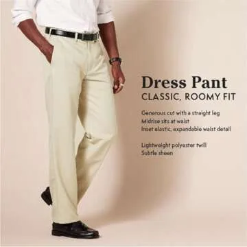 Show moreStep into style and comfort with the Amazon Essentials Men's Classic-Fit Expandable-Waist Flat-Front Dress Pant. Designed with a classic fit that’s roomy through the hip and thigh and a straight leg cut, these black dress pants sit comfortably at the waist, making them a perfect choice for any occasion. Crafted from a high-quality polyester twill suiting material, each pair offers a subtle sheen that elevates your look from everyday casual to a sophisticated business attire. Whether you opt for the conventional or eco-friendly recycled polyester fabric, you get a timeless piece that prioritizes both style and sustainability.