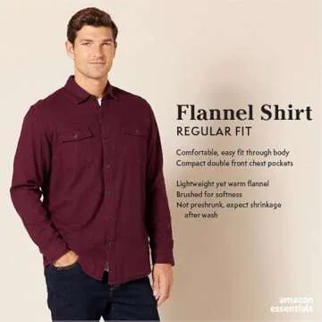 Show moreIntroducing the Amazon Essentials Men's Long-Sleeve Flannel Shirt, your new go-to for rugged comfort and undeniable style. Crafted from **100% brushed cotton**, this flannel shirt is designed for an exceptional wearing experience, featuring a pleasing texture that offers both warmth and durability. With its **regular fit**, the shirt provides ample room in the shoulders, chest, and waist for effortless movement, making it an ideal choice for both leisurely weekends and active days. The striking black and burgundy plaid pattern adds a touch of classic fashion to your everyday wardrobe, ensuring you always look sharp, whether you’re heading out for a casual dinner or just lounging at home.