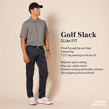 Show moreThe Amazon Essentials Men's Slim-Fit Stretch Golf Pant seamlessly combines style and functionality, allowing you to look sharp whether you're on the green or enjoying casual outings. Designed with athletic individuals in mind, this fitted pant boasts a modern silhouette that not only enhances your physique but also provides ultimate comfort. The lightweight, moisture-wicking fabric ensures that you stay dry and comfortable, helping you to focus on your game. With its wrinkle-resistant material and thoughtful details, these golf pants are the perfect addition to your golfing wardrobe.