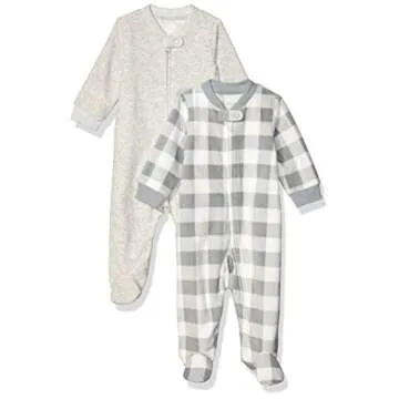 Amazon Essentials Unisex Babies' Microfleece Footed Zip-Front Sleep and Play, Pack of 2, Grey Buffalo Check/Light Grey Heather, 3-6 Months