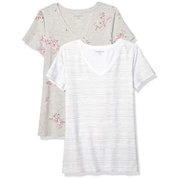 Amazon Essentials Women's Classic-Fit Short-Sleeve V-Neck T-Shirt - Discontinued Colors, Pack of 2, Grey, Floral/Stripe, Small