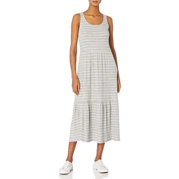 Show more Introducing the Amazon Essentials Women's Cozy Knit Rib Sleeveless Tiered Maxi Dress, a stunning blend of comfort and sophistication that will elevate your wardrobe. This stylish maxi dress is crafted from a soft brushed stretch knit, ensuring a luxurious feel against your skin while promising long-lasting durability. With its clever design, the dress fits gracefully through the chest and waist, flaring out to create a flattering A-line shape that is suitable for various body types.