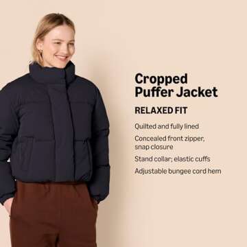 Amazon Essentials Women's Cropped Full-Zip Puffer Jacket (Quilted Matte or Sherpa Fleece), Black, Large