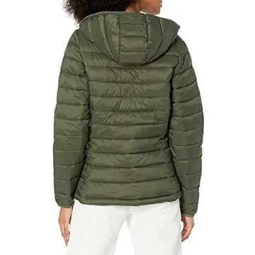 Show more The Amazon Essentials Women's Lightweight Long-Sleeve Full-Zip Water-Resistant Packable Hooded Puffer Jacket is the ultimate companion for cool weather adventures. Crafted with a blend of durable, water-resistant fabric and thoughtfully designed for comfort, this jacket features a slightly tailored fit through the waist that flattering shapes your silhouette while allowing for unrestricted movement. The lightweight construction ensures you stay warm without the bulk, making it easy to pack and carry wherever life takes you.