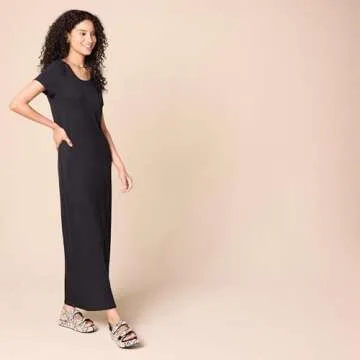 Show moreStep out in style and comfortAmazon Essentials Women's Short-Sleeve Maxi Dress. This versatile piece, available in a sleek black color, is designed with a regular fit that hugs your silhouette just right—providing a close, yet comfortable fit through the chest, waist, and hips. Made from a luxurious rayon stretch jersey, this dress offers a lightweight feel along with a polished finish that drapes beautifully, ensuring you’ll feel fabulous whether you’re running errands or heading out for a night on the town.