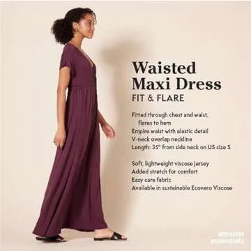 Show moreIntroducing the Amazon Essentials Women's Waisted Maxi Dress, a stunning addition to your wardrobe designed for comfort and versatility. Crafted from a soft and luxurious rayon stretch jersey, this dress is not just beautiful but also eco-conscious, available in a sustainably sourced variant featuring 95% Lenzing Ecovero Viscose. The signature fit and flare design hugs the body perfectly through the chest and waist, then gracefully flares out to the hem, providing a flattering silhouette that enhances your natural curves.