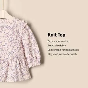 Show moreIntroducing the Amazon Essentials x Sofia Grainge Toddler Girls' 3/4 Sleeve Knit Top, Pack of 2! This enchanting set, featuring delicate floral and soft pink designs, is perfect for your little fashionista. Crafted from baby-soft and super smooth cotton knit fabric, these tops are designed to provide comfort without sacrificing style. The 3/4 length puff sleeves with elasticated openings add a touch of whimsy, while the playful peplum detail makes any outfit pop. Designed in collaboration with the talented Sofia Grainge, this collection captures the essence of childhood with trendy and charming pieces, ensuring your little one stands out in every crowd. Enjoy the relaxed fit, ideal for active days playing, learning, and exploring.