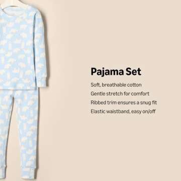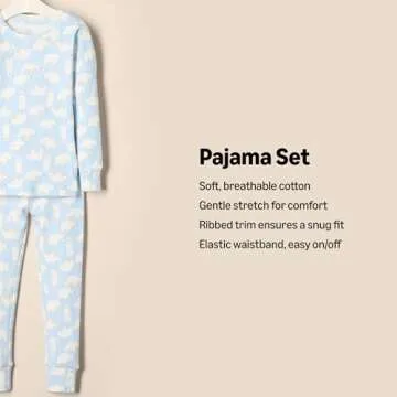 Show more Introducing the Amazon Essentials x Sofia Grainge Unisex Babies' Snug-Fit Cotton Pajamas, a delightful collaboration that brings inspired styles to little ones aged 18 months. Crafted from soft midweight cotton micro-rib knit, these pajamas offer a gentle stretch that ensures utmost comfort for your baby. The light blue fabric adorned with adorable polar bears is not only visually appealing but also perfect for keeping your child cozy during bedtime, irrespective of the season. A thoughtful design, featuring ribbed trim on the neckline, cuffs, and ankles, adds both charm and functionality to these essential sleepwear pieces.