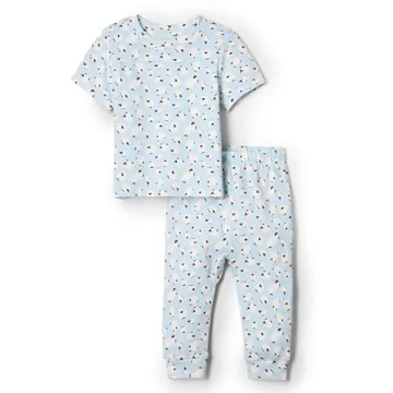 Made from the finest quality, baby-soft cotton knit fabric, this outfit ensures breathability and smoothness against your child's delicate skin. Designed with a classic fit, the tee features short sleeves and a classic crew neckline, making it easy for little ones to put on and take off on their own. The matching pants are practical yet stylish, with a pull-on elastic waist that adapts to your child's movements, and cuff detailing at the leg openings for an extra touch of charm.