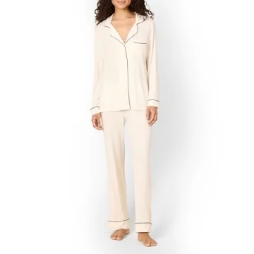 Show moreSlip into serene comfort with the Amazon Essentials x Sofia Grainge Women's Pajama Set, an ideal blend of style and relaxation that caters to modern sleepwear enthusiasts. Crafted from midweight, super soft modal jersey, this pajama set is incredibly soft against the skin while maintaining a breathable quality that's perfect for all seasons. The classic button-front long sleeve top features a refined notch collar and a convenient single patch pocket, complementing the elasticated waistband of the matching pants that ensures a snug yet flexible fit. The delicate contrast piping adds a touch of elegance, making it not just sleepwear, but a statement piece in your loungewear collection.