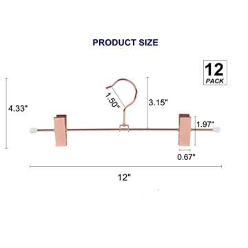 Show moreElevate your closet organization with the Amber Home 12 Pack Rose Copper Gold Metal Pants Skirt Hangers. Crafted with exquisitely plated rose gold, these hangers not only add a touch of elegance to your wardrobe but also maximize your storage space, measuring at 12 inches wide and 4.33 inches high. Each pack comes with 12 durable hangers designed to hold a variety of clothing types securely. Made with strong construction, the metal base ensures they won’t bend under the weight of heavier garments while maintaining their stunning finish.