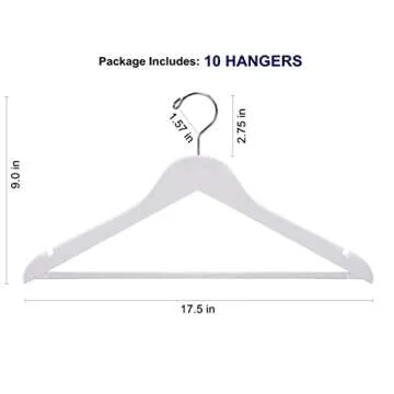 Show moreElevate your wardrobe organization with the **Amber Home White Wooden Hangers 10 Pack**. Crafted from premium solid wood, these hangers exude elegance while providing exceptional functionality. Each hanger measures 17.5 inches in width and 9 inches in height, designed to maximize your closet's storage space seamlessly. The stunning white lacquered finish not only enhances their aesthetic appeal but also protects them from wear and tear, ensuring longevity in your daily wardrobe routine. These hangers are versatile enough for tank tops, suits, jeans, coats, and dresses, making them a perfect addition to any closet.