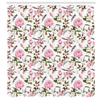 Ambesonne Flower Shower Curtain, Apple and Cherry Flowers and Blossoms with Feathers Shabby Style of Classical Botanic Retro Artwork, Cloth Fabric Bathroom Set with Hooks, 69" W x 70" L, Pink Green