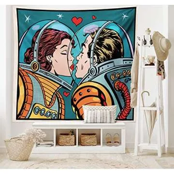 Ambesonne Love Tapestry, Space Man and Woman Astronauts Kissing Science Cosmos Couple Pop Art Design Print, Wide Wall Hanging for Bedroom Living Room Dorm, 80" X 60", Orange Teal