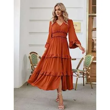 Amegoya Women's V Neck Long Sleeve Boho Maxi Dress Smocked Empire Waist Flowy Ruffle Tiered Photoshoot Dress (Burnt Orange S)