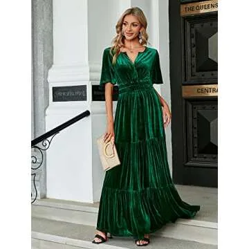 Amegoya Women's Velvet Short Sleeve V Neck Maxi Dress for Weddings & Parties
