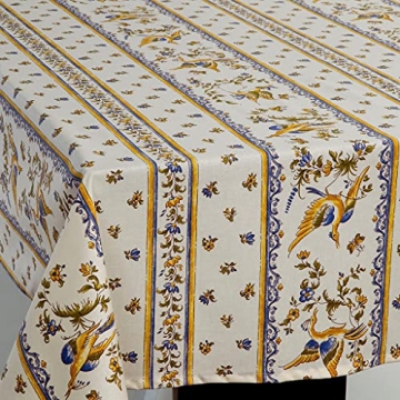 Show moreElevate your dining experience with the Amelie Michel Wipe-Clean French Tablecloth in Moustiers, Blue. Named after the enchanting village of Moustiers in France, this stunning tablecloth captures the essence of traditional French country style. It features classic motifs of birds, flowers, and vines, beautifully intertwined in soft shades of blue, yellow, and green against a serene ivory backdrop. Crafted from premium acrylic-coated cotton, this tablecloth combines both aesthetic charm and practicality, making it a delightful addition to both casual and formal dining settings.