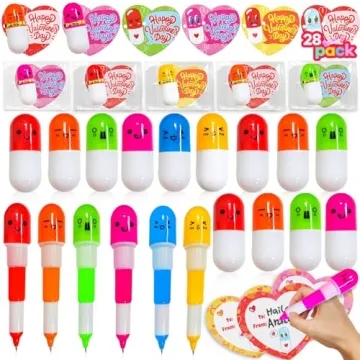 Show moreCelebrate the joy of giving with our delightful Valentine's Day Gift Cards Set! This charming collection includes 28 retractable vitamin pill-shaped pens, each designed with a cute smiley face and available in 6 vibrant colors: blue, green, red, yellow, purple, and orange. These pens are not just fun; they are also conveniently retractable, making them the perfect companion for kids on the go! The set also comes with 28 transparent OPP gift bags and 28 heart-shaped Valentine's cards, creating a complete package for spreading love and joy.
